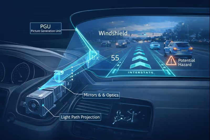 The apparent distance of HUD images — how far away they seem to float — results from optical design rather than actual light positioning. A windshield projection display car system uses mirrors and lenses to create a virtual image that appears significantly farther from the driver than the physical components that generate it. Current systems typically create images appearing 2-3 meters ahead of the driver for basic HUDs, or 10-15 meters ahead for advanced AR systems. This distant apparent position allows drivers to view HUD information without refocusing their eyes from the road, reducing the visual accommodation effort that reading close instruments requires.